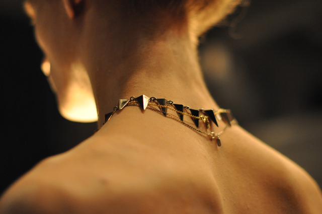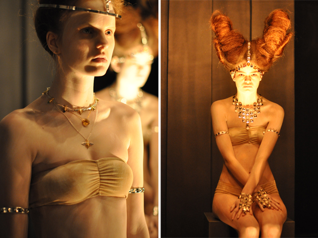 As you walked into the space you were confronted with three nearly nude individuals. The only thing separating you from whole bare flesh were a few nude bits and pieces. No, this wasn't done in the interest of showing off flesh. The nearly nudes were showing off the masterful work of Maria Nilsdotter's clever hands. Her jewellery shined in the light and seemed to contain a sort of magical element. That could have had something to do with the fact that the hair styles of the models and the lighting of the room made you feel as if you had entered a parallel universe, but that's all part of the charm.