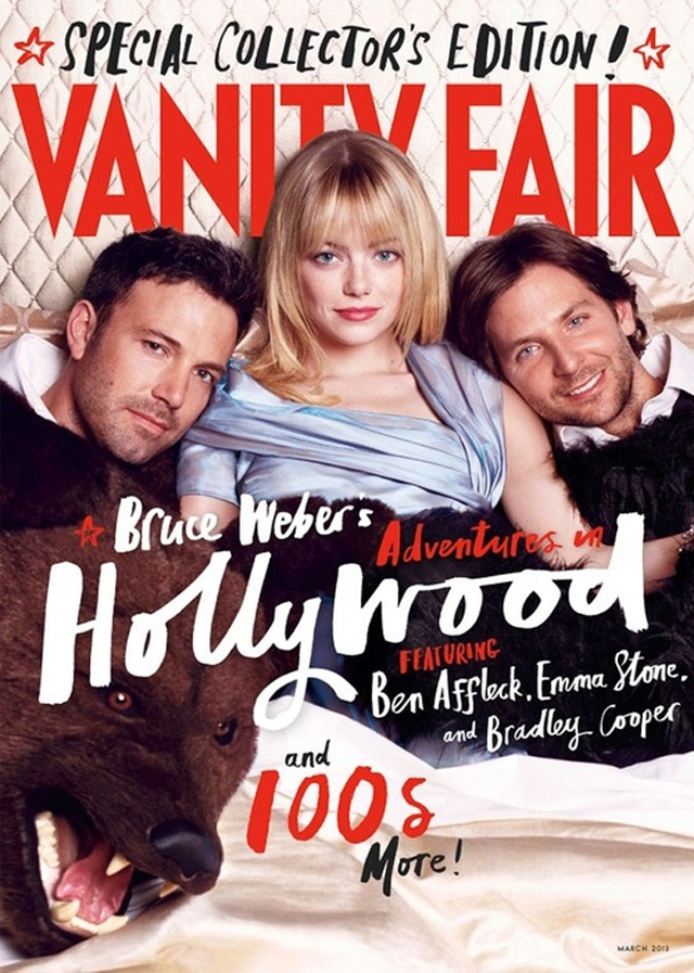Did you ever imagine you'd see Emma Stone, Ben Affleck and Bradley Cooper in bed together? Well, Vanity Fair made it happen. Thanks to the photographic talents of Bruce Weber, we have the three actors as bedfellows for the cover of Vanity Fair March 2013. Titled "Adventures in Hollywood," it looks like Bruce Weber has quite the interesting issue in store for us. If the cover is any indication of the content, we might be buying more than one copy. {Vanity Fair}